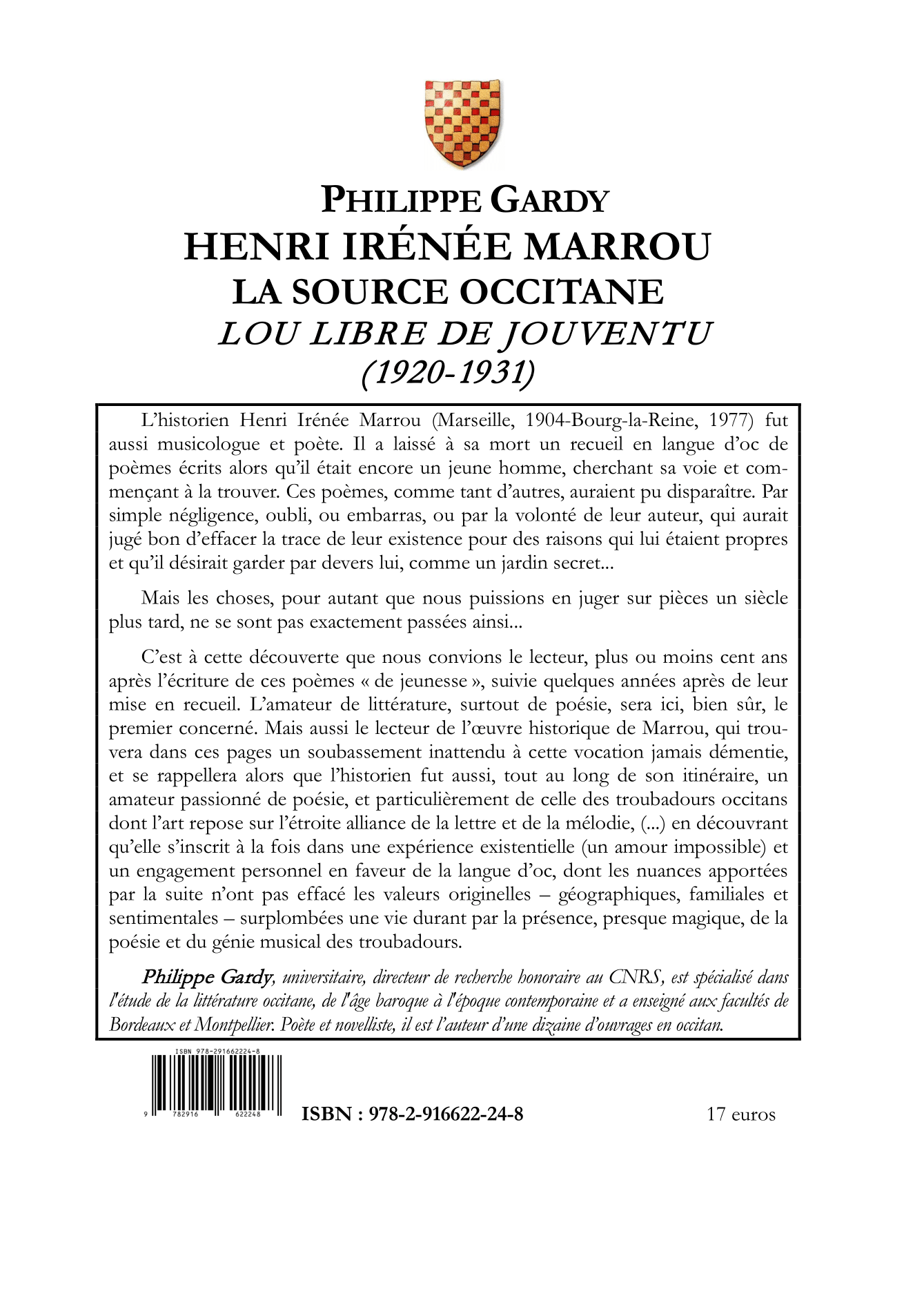 L’historien Henri Irénée Marrou (Marseille, 1904 – Bourg-la-Reine, 1977) fut aussi musicologue et poète. Il a laissé à sa mort un recueil en langue d’oc de poèmes écrits alors qu’il était encore un jeune homme, cherchant sa voie et commençant à la trouver. Ces poèmes, comme tant d’autres, auraient pu disparaître. Par simple négligence, oubli, ou embarras, ou par la volonté de leur auteur, qui aurait jugé bon d’effacer la trace de leur existence pour des raisons qui lui étaient propres et qu’il désirait garder par devers lui, comme un jardin secret…